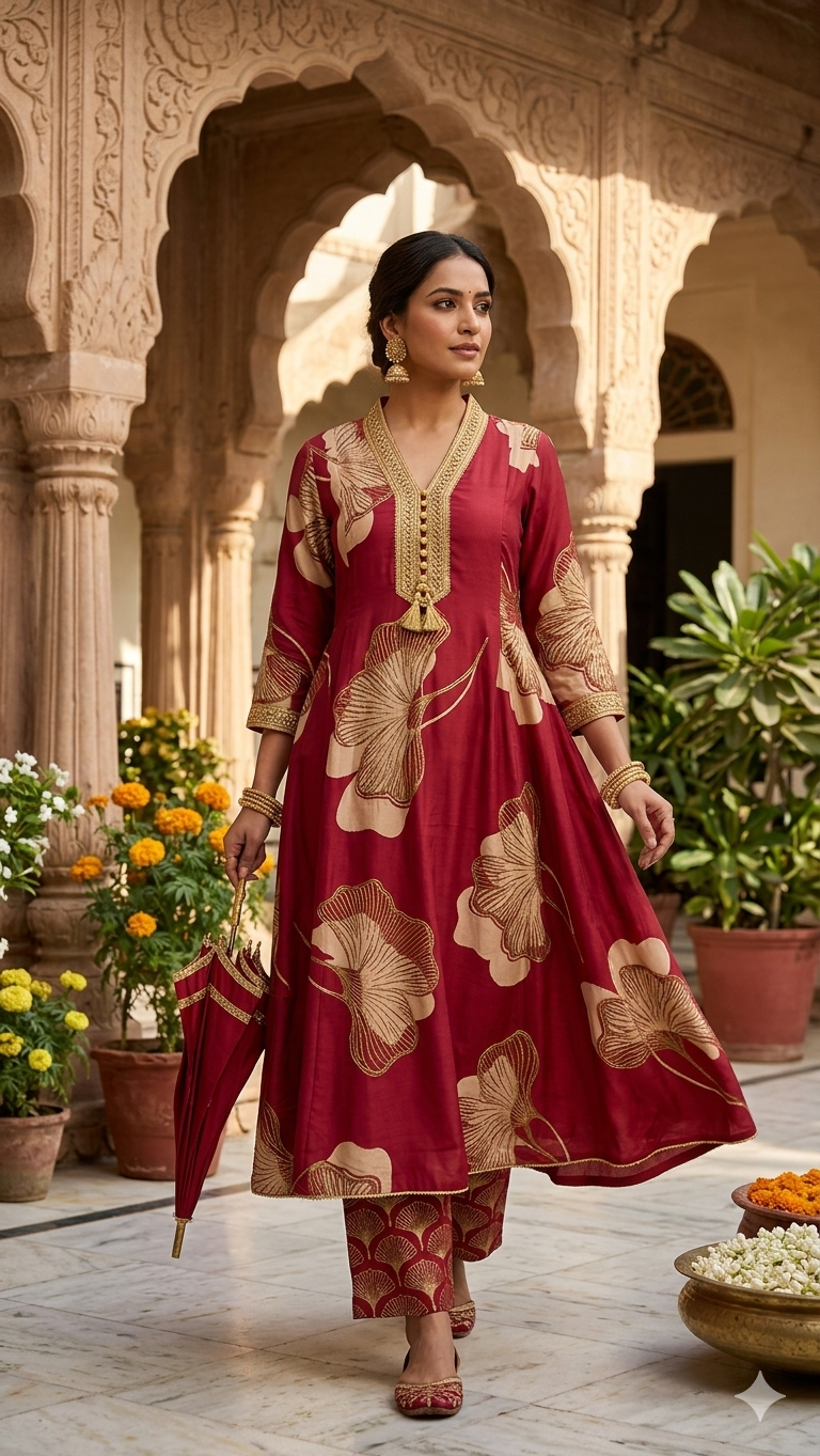 Step into royalty with this breathtaking crimson and gold ensemble. This elegant A-line kurti features striking, oversized golden botanical motifs that catch the light beautifully. The plunging V-neckline is richly adorned with intricate gold zari work and delicate tassel detailing, perfectly complementing the bordered three-quarter sleeves. Paired with coordinating straight pants featuring a subtle scalloped gold pattern, matching embroidered juttis, and a charming parasol, this look is a beautiful nod to rich cultural heritage. Set against the majestic carved arches of a traditional courtyard, this outfit exudes timeless grace and festive grandeur.