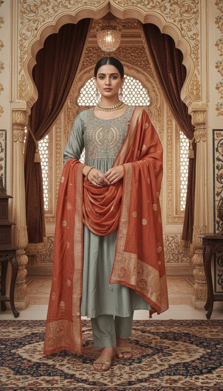 Exude timeless grace in this deep wine-toned Anarkali set. The kurti features an intricately embroidered yoke with traditional motifs, paired with matching straight-cut trousers. The look is beautifully elevated by a lightweight blush pink dupatta adorned with gold zari borders and delicate floral buttis, making it an ideal choice for festive celebrations and heritage-themed events.