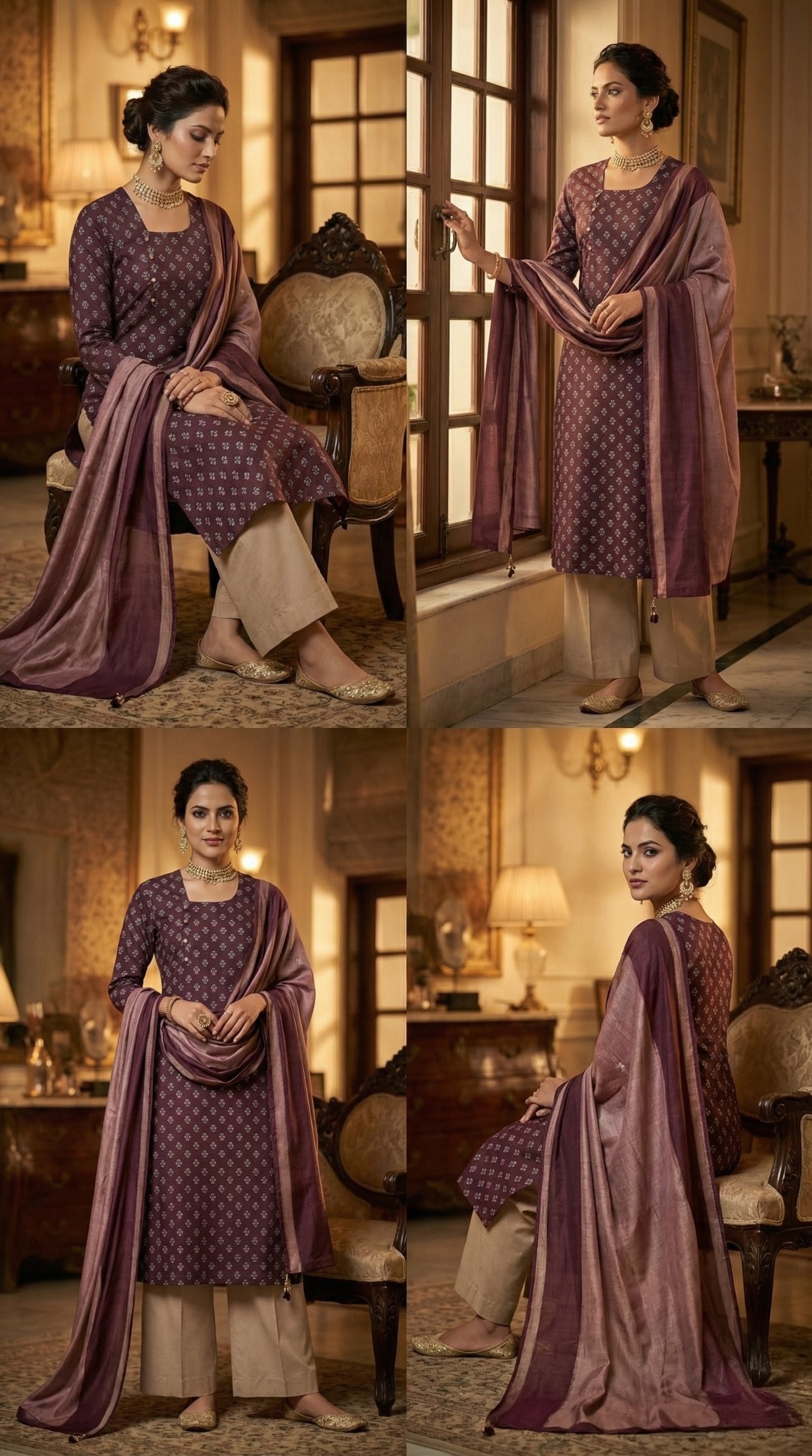 This image features a woman in an elegant, traditional Indian ensemble. She is wearing a deep mauve or wine-colored long kurta adorned with a delicate, repetitive silver floral print. The kurta features a square neckline with button detailing and is paired with beige wide-leg palazzo trousers. Completing the look is a matching silk dupatta draped over her shoulders and gold-toned traditional accessories, including a choker necklace, jhumka earrings, and embroidered jutti footwear. The setting is a warm, classically furnished interior that complements the sophisticated aesthetic of the outfit.
