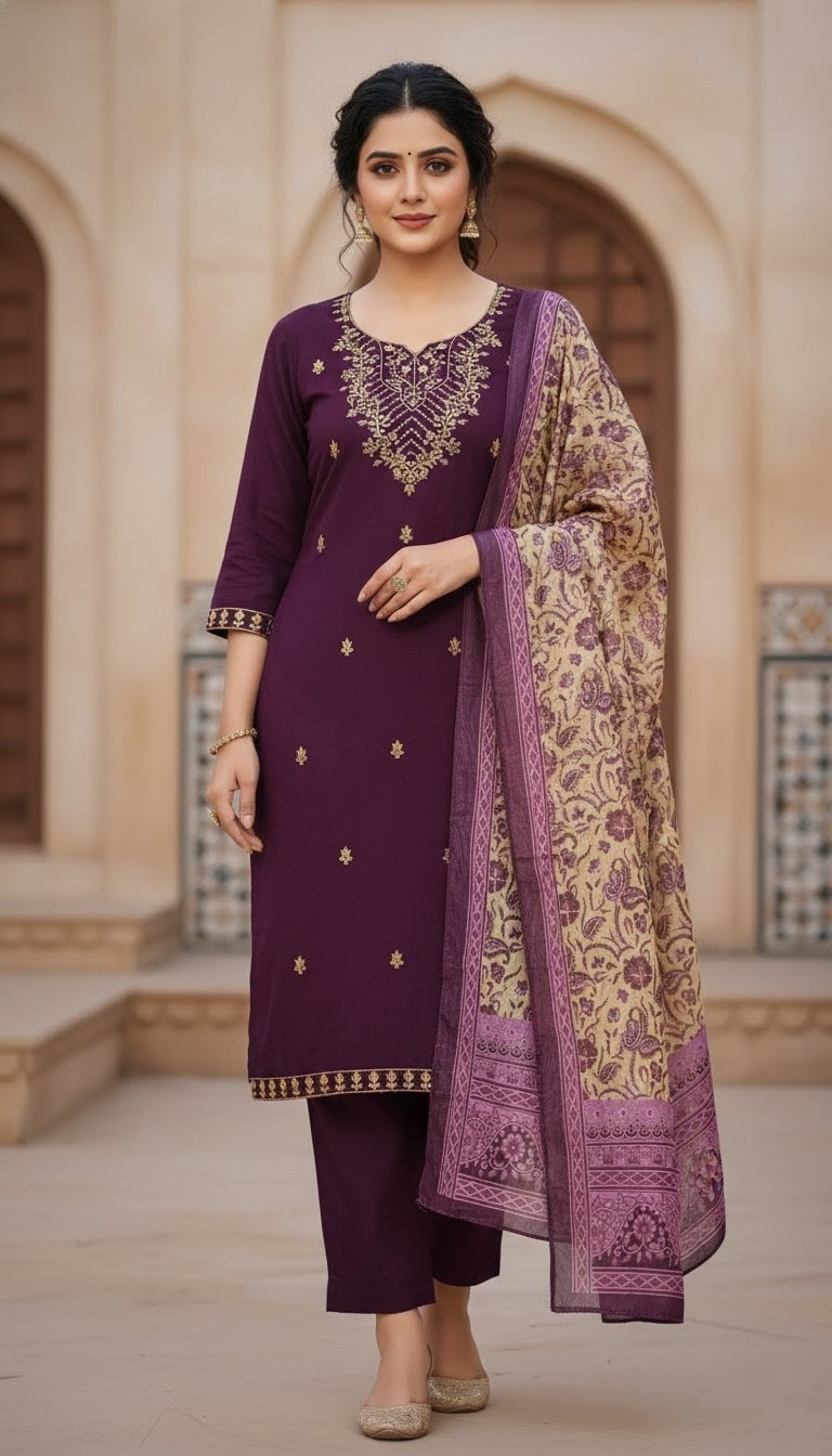 A blend of rich jewel tones and traditional prints, this forest green set is designed for the modern woman A who values heritage. The straight-cut kurti is adorned with meticulous gold work at the neckline, while the lightweight, printed dupatta adds a layer of artistic texture. Detailed hemlines on the trousers ensure a polished finish from head to toe.
