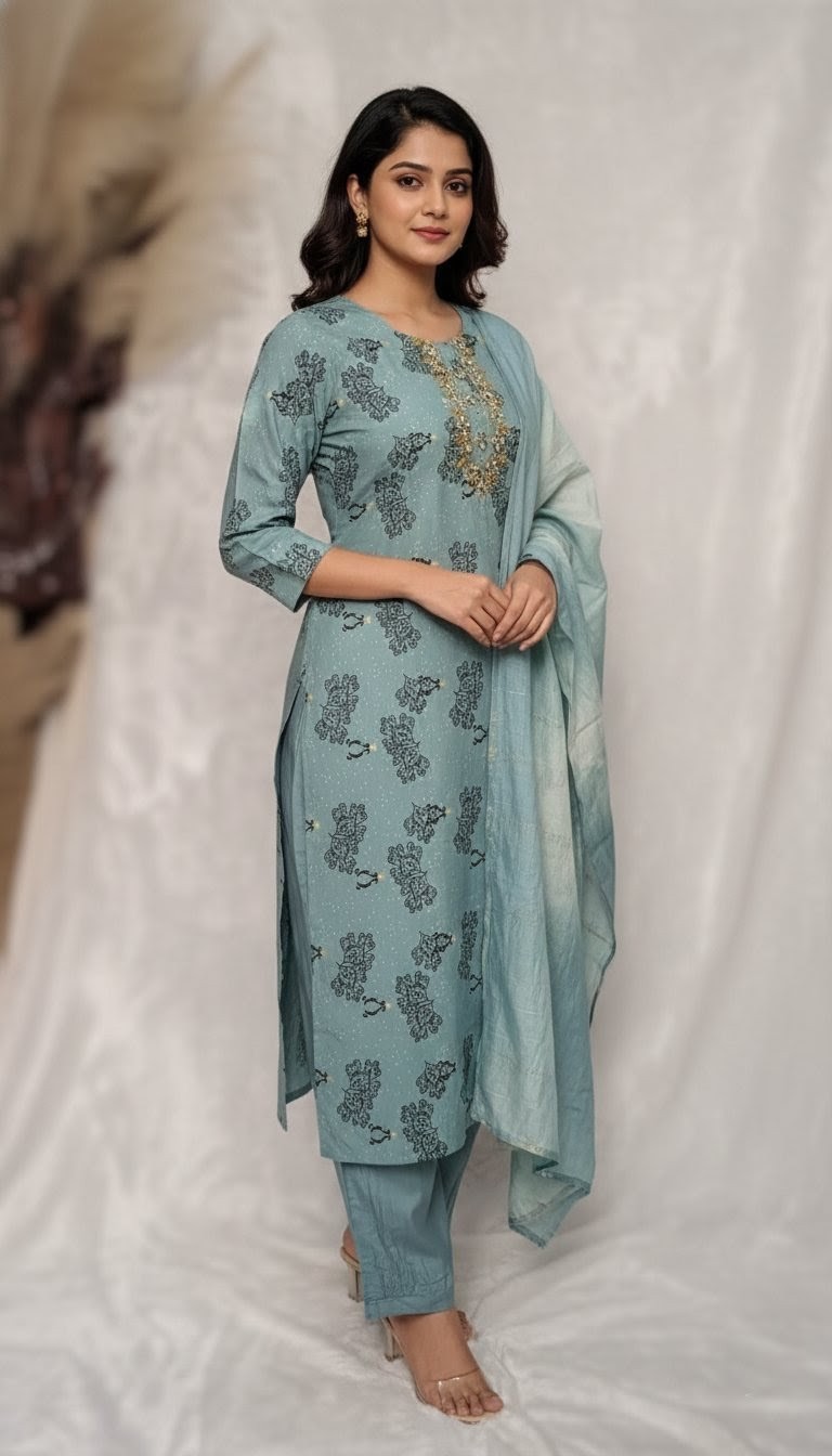 A professional catalog shot showcasing a women's ethnic set. Features include a round neck with gold embroidery, 3/4 sleeves, printed trousers, and a coordinating lightweight dupatta with tassel accents, presented in high-fidelity clarity against a clean studio backdrop.