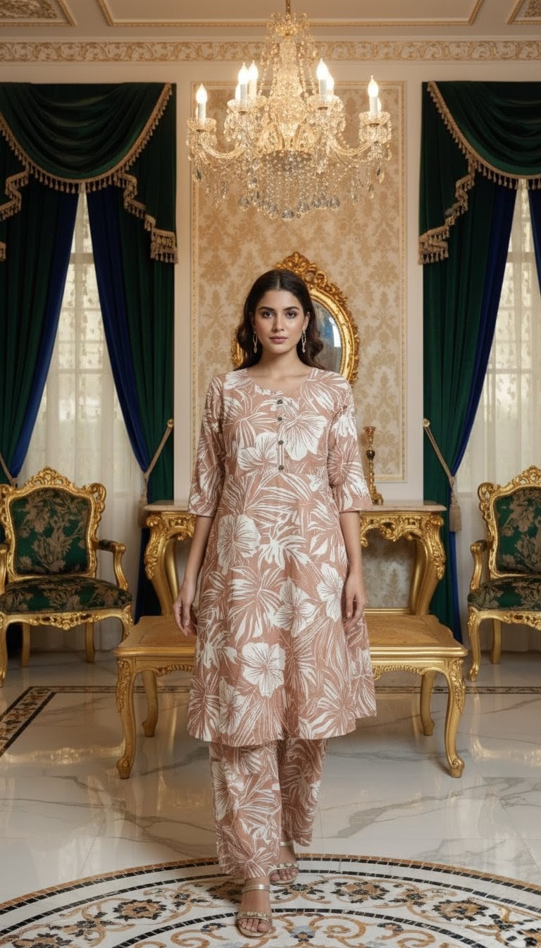 High-resolution fashion meets traditional craftsmanship. This three-quarter sleeve tunic features a button-detail neckline and a flared hem for a graceful movement. Paired with wide-leg printed trousers, this outfit is designed for a premium look and feel.