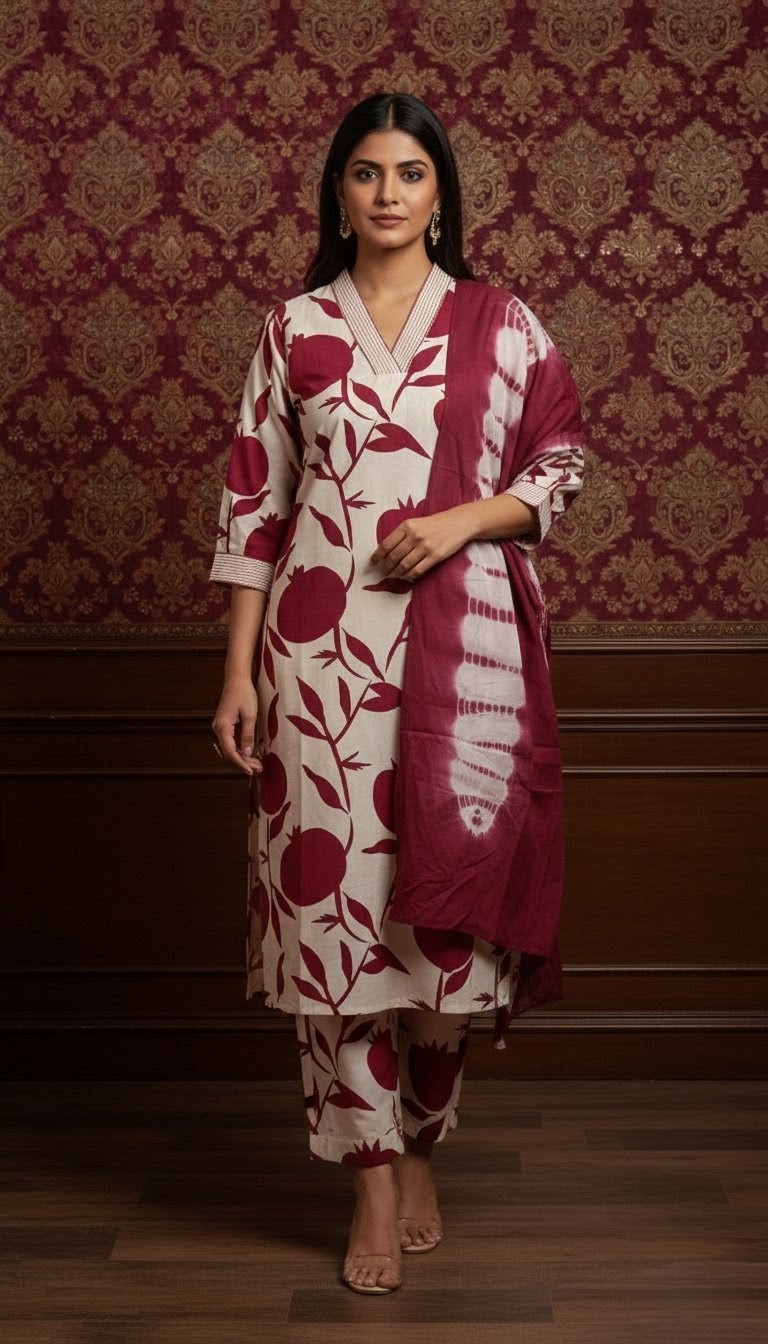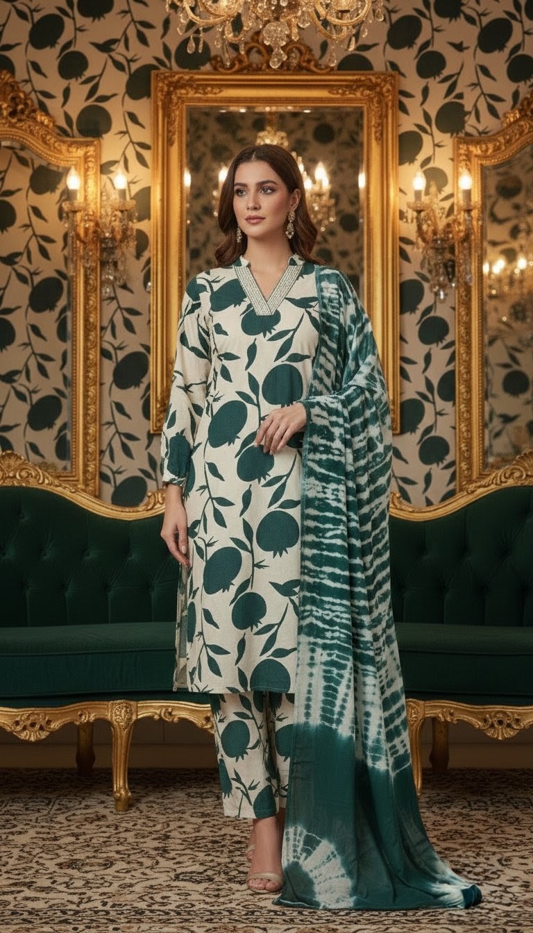 Radiant and sophisticated, this three-piece set offers a fresh take on artisanal prints. The expertly tailored straight-fit kurta and coordinating pants create a sleek silhouette, while the flowing, patterned dupatta adds an artistic layer of texture. It is an ideal choice for high-end boutique collections and festive events where style meets substance.