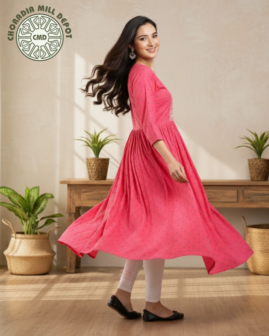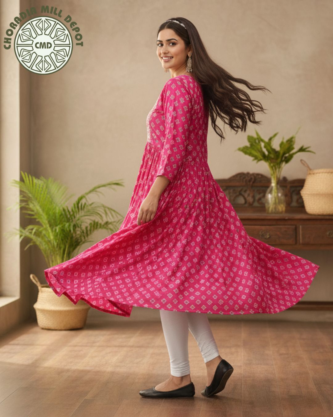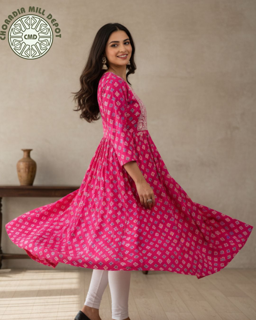 This vibrant fuchsia pink Anarkali from Choradia Mill Depot (CMD) beautifully blends traditional craftsmanship with a modern, graceful silhouette. Featuring a classic Bandhani-inspired geometric print and intricate white embroidery along the neckline, the design is cinched at the waist to create a stunning, voluminous flare perfect for twirling. Paired with crisp white leggings and elegant silver jhumkas, this three-quarter sleeve kurta offers a sophisticated yet breezy look for festive celebrations or refined daytime events.