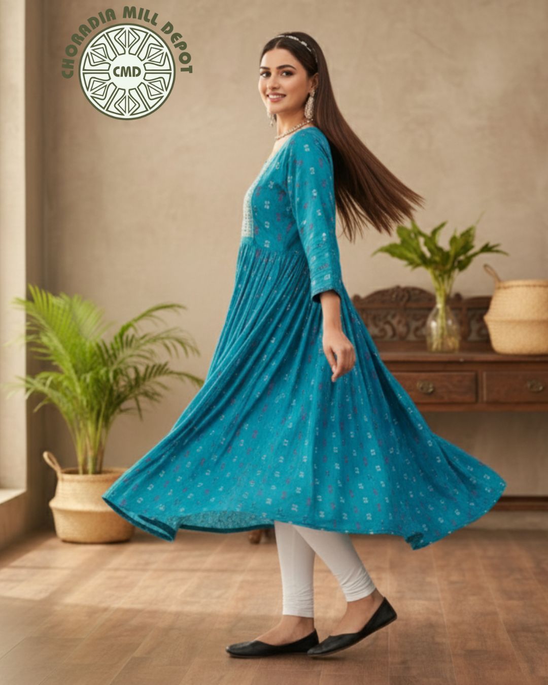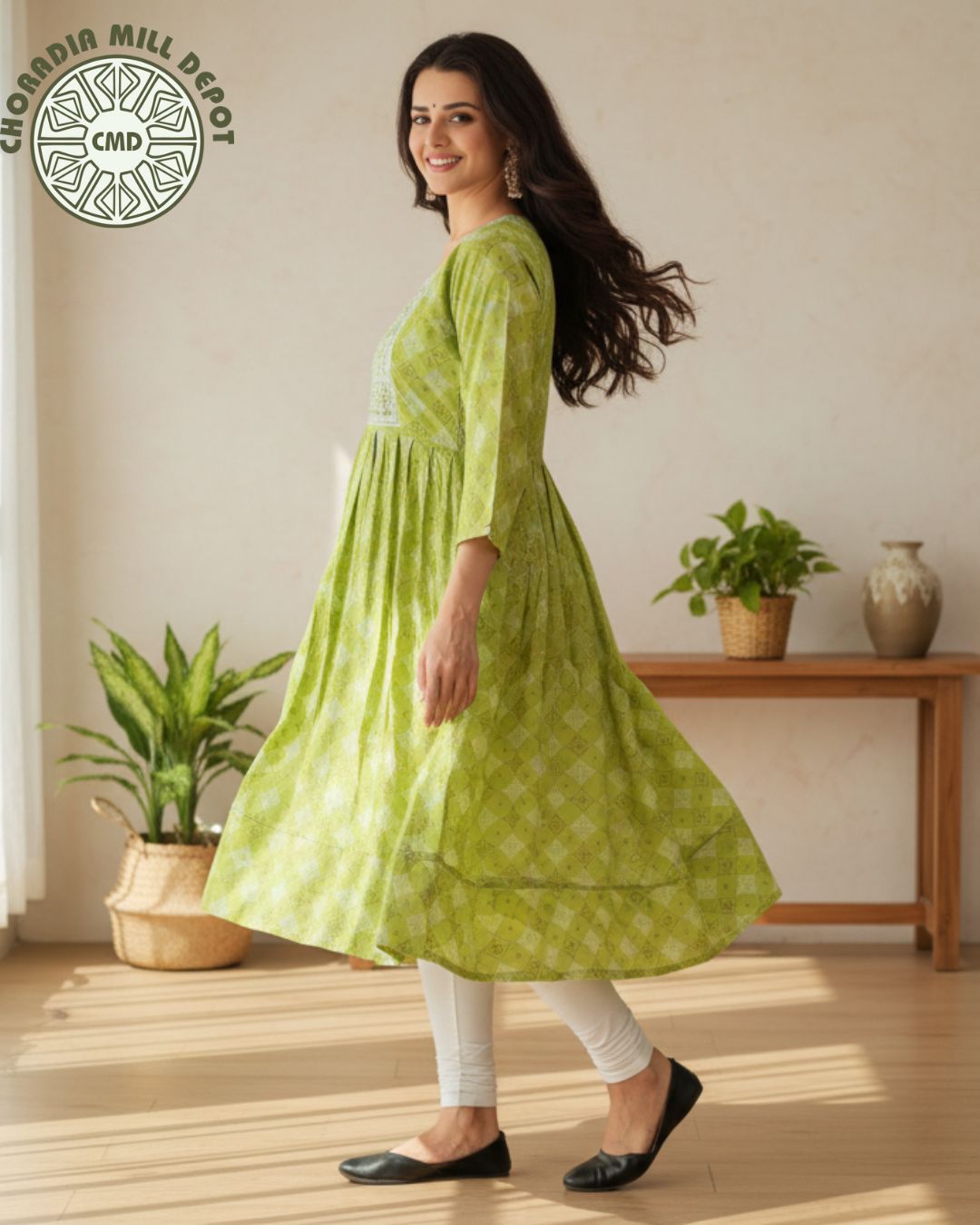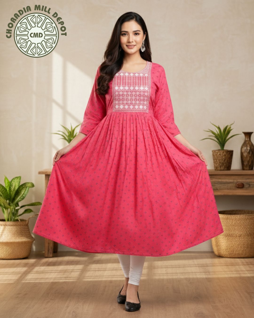 This vibrant fuchsia pink Anarkali from Choradia Mill Depot (CMD) beautifully blends traditional craftsmanship with a modern, graceful silhouette. Featuring a classic Bandhani-inspired geometric print and intricate white embroidery along the neckline, the design is cinched at the waist to create a stunning, voluminous flare perfect for twirling. Paired with crisp white leggings and elegant silver jhumkas, this three-quarter sleeve kurta offers a sophisticated yet breezy look for festive celebrations or refined daytime events.