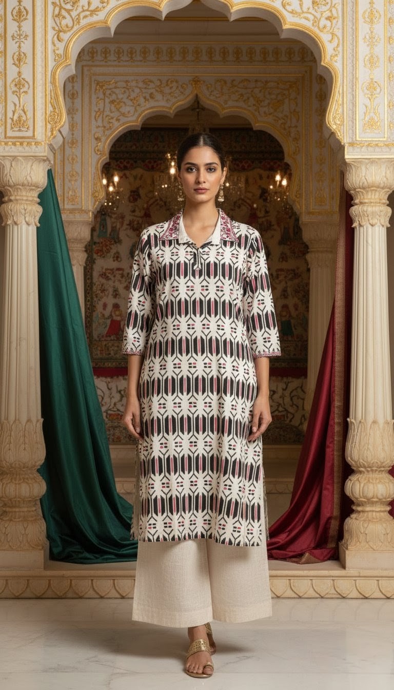 Experience the perfect harmony of contemporary structure and traditional artistry. This ivory-based kurti features a bold black and magenta geometric pattern, accented by an intricately embroidered shirt collar. Set against a backdrop of ornate golden arches, it represents the ultimate in "Royal Ethnic" fashion.