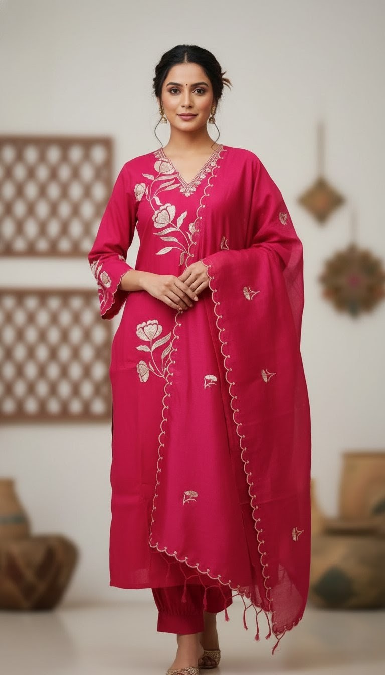 Elevate your ethnic wardrobe with this stunning fuchsia co-ord set. Designed for the modern woman who loves a touch of tradition, this outfit features intricate thread work and a unique scalloped edge on the dupatta. Style it with gold jhumkas for a look that radiates royal elegance.