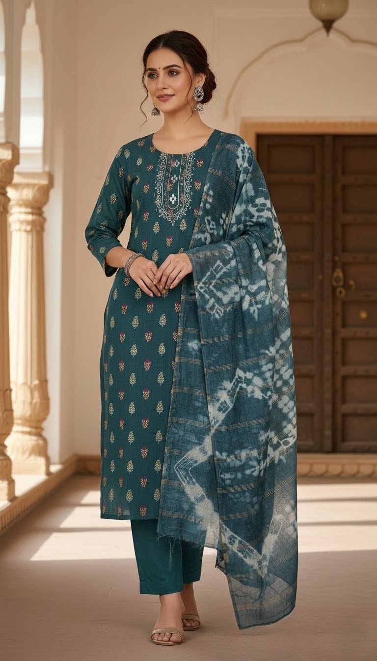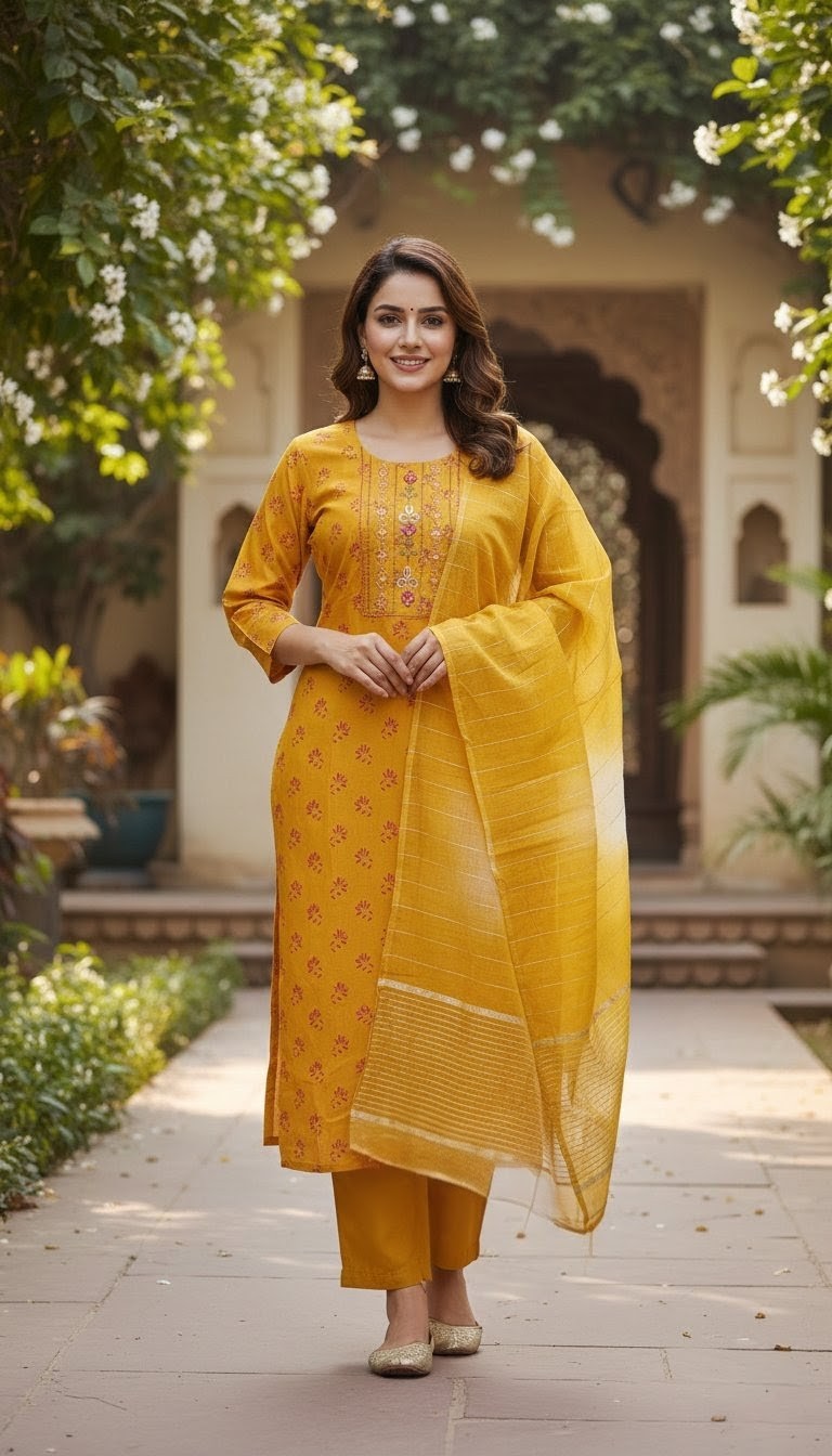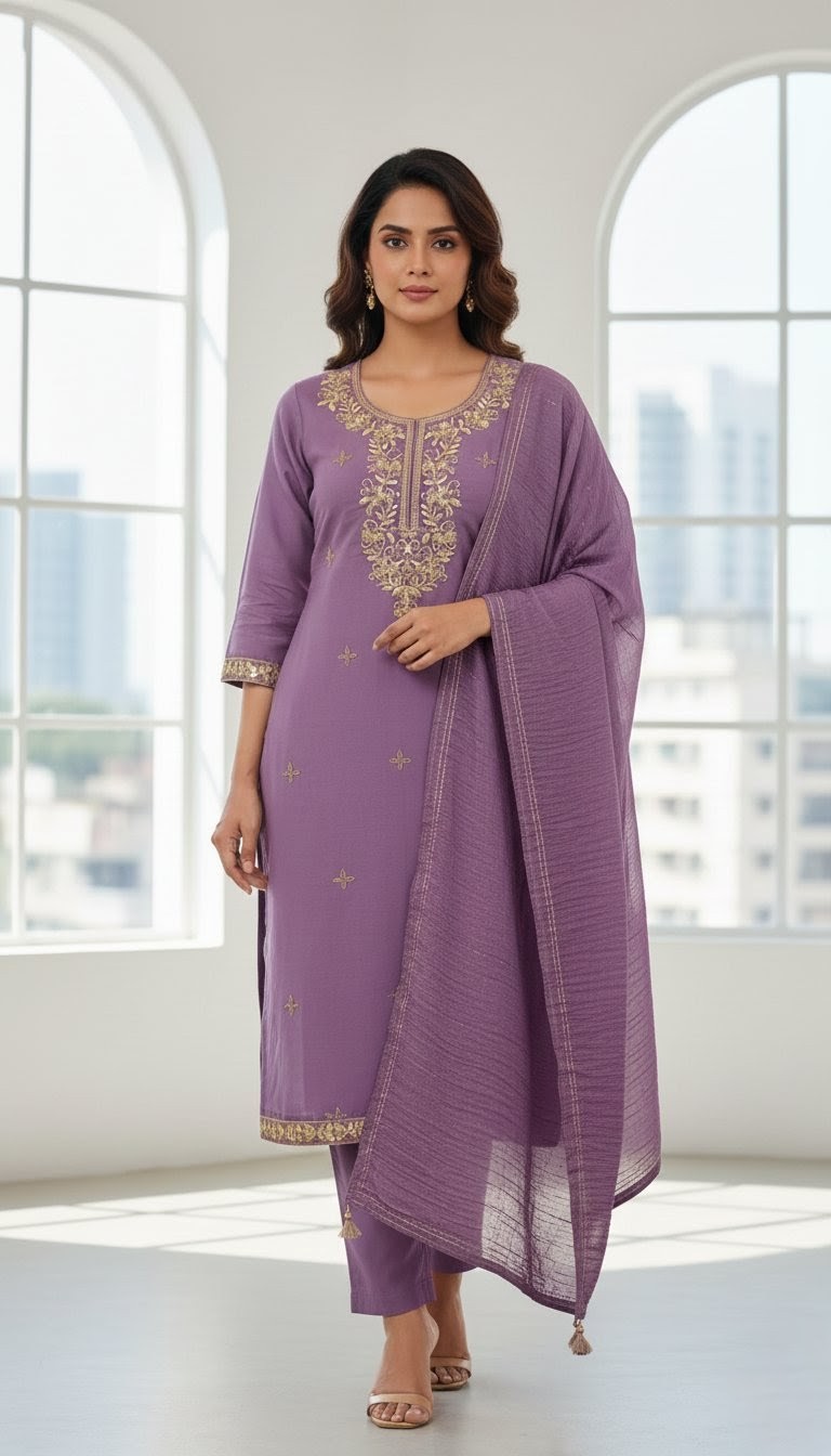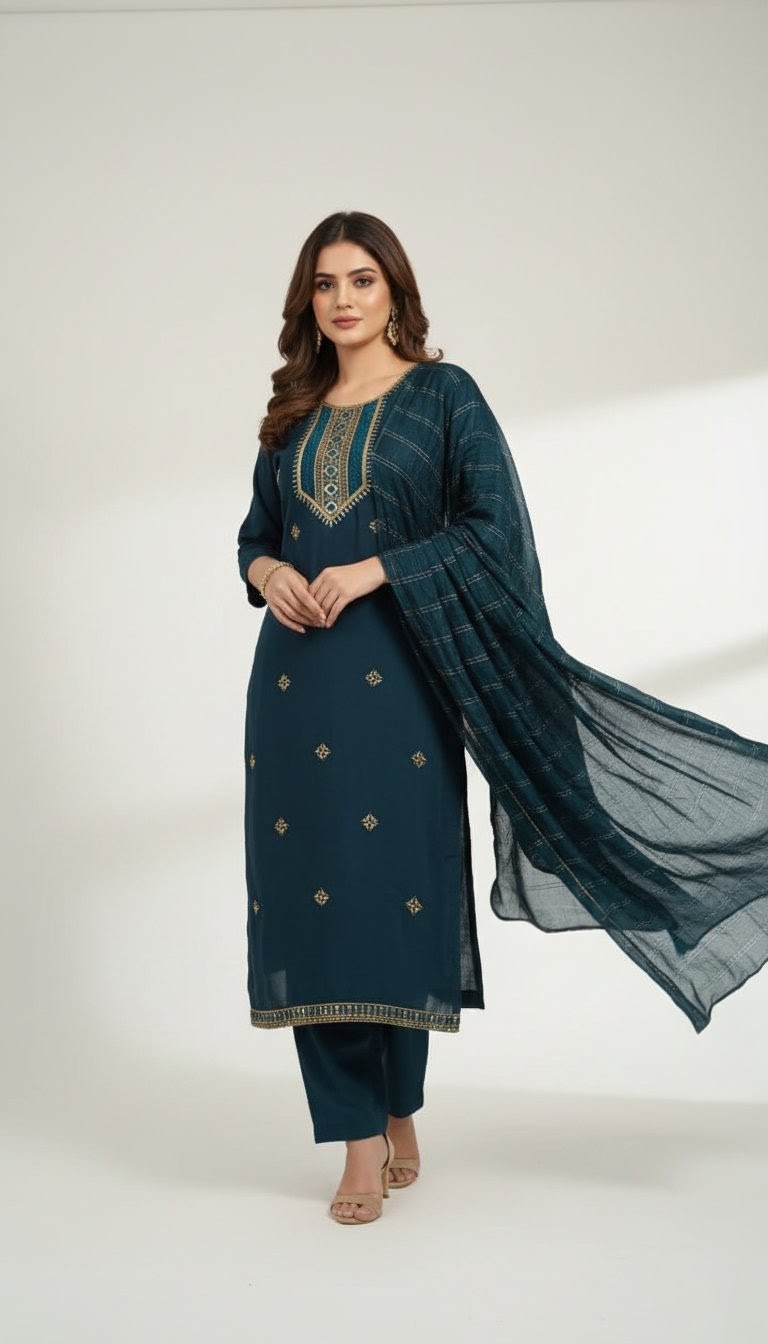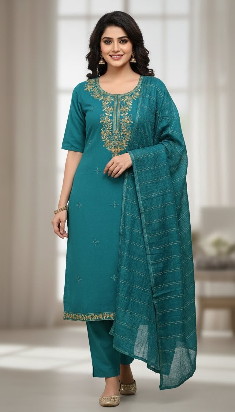 Exude timeless elegance in this deep maroon straight-cut salwar kameez, a perfect blend of tradition and sophistication. The outfit features exquisite golden zari embroidery along the neckline and hem, complemented by a matching dupatta with delicate gold-striped detailing. Paired with coordinating trousers and finished with traditional jhumkas, this ensemble is a stunning choice for evening celebrations or festive occasions where you want to make a regal impression