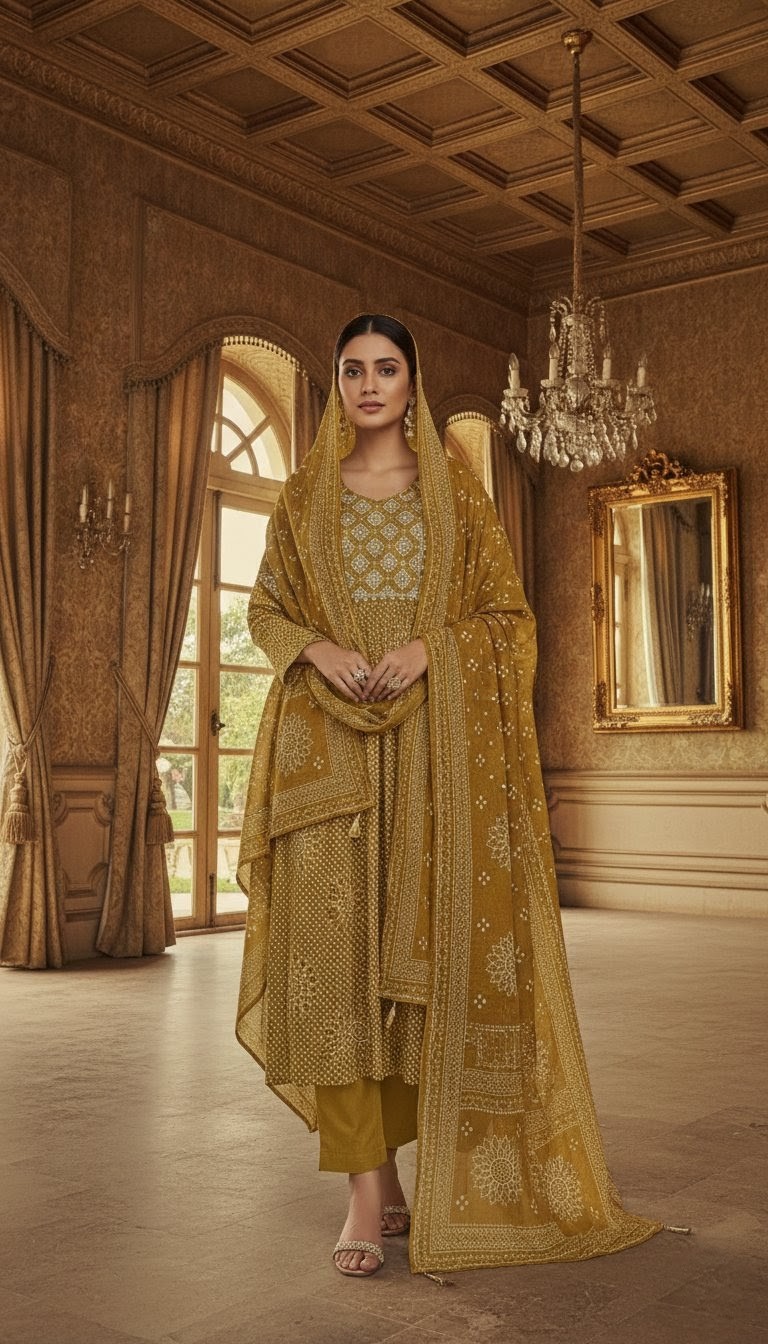 A breathtaking mustard-gold ensemble featuring a flared umbrella-cut kurta adorned with delicate white Bandhani-inspired prints. The look is completed with a heavily patterned dupatta and solid straight-cut trousers, set against a majestic royal interior that emphasizes the outfit's high-end craftsmanship.