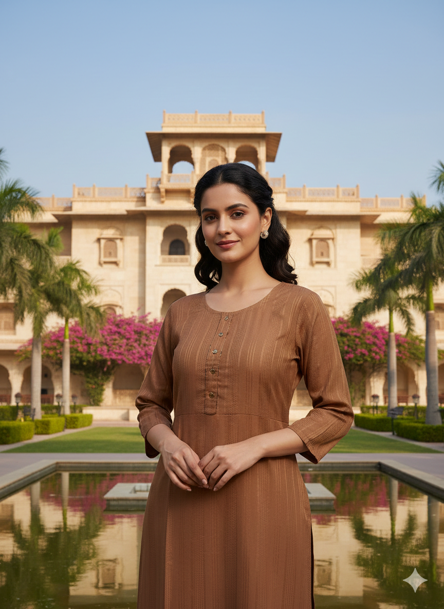 Elevate your daily ethnic wardrobe with this cedar brown straight-fit kurti. Crafted from high-quality fabric with a delicate vertical weave, it offers both breathability and a polished silhouette. The round neckline is detailed with a decorative button placket for added charm, while the 3/4 sleeves provide a timeless look. Style it with white leggings or palazzos for a clean, professional ensemble.