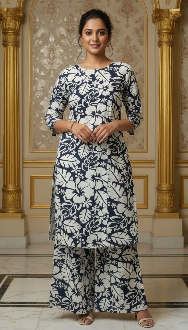 Fresh, artistic, and effortlessly stylish. This coordinated set redefines ethnic wear with its oversized botanical patterns and premium tailored finish. The round neckline and three-quarter sleeves offer a timeless look, while the flowing trousers ensure all-day comfort without compromising on elegance. Ideal for festive brunches or high-end evening events.