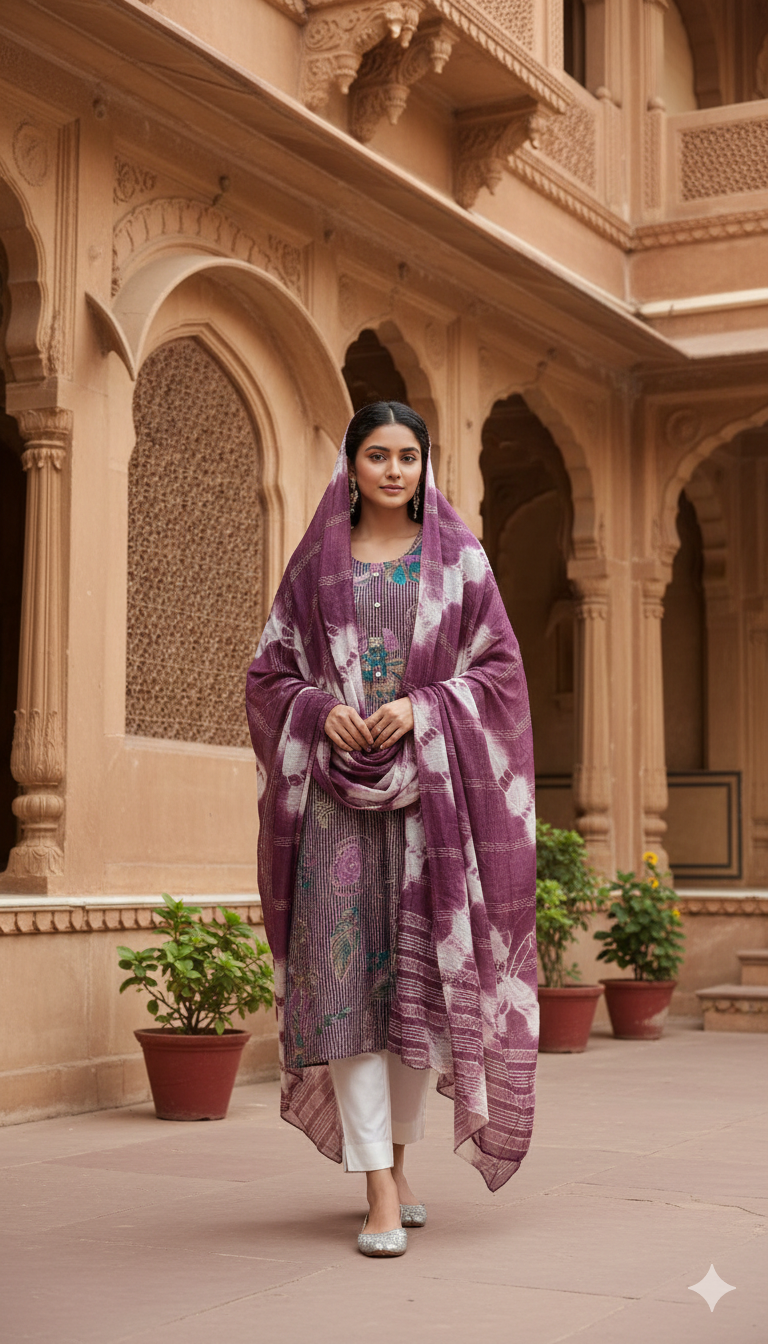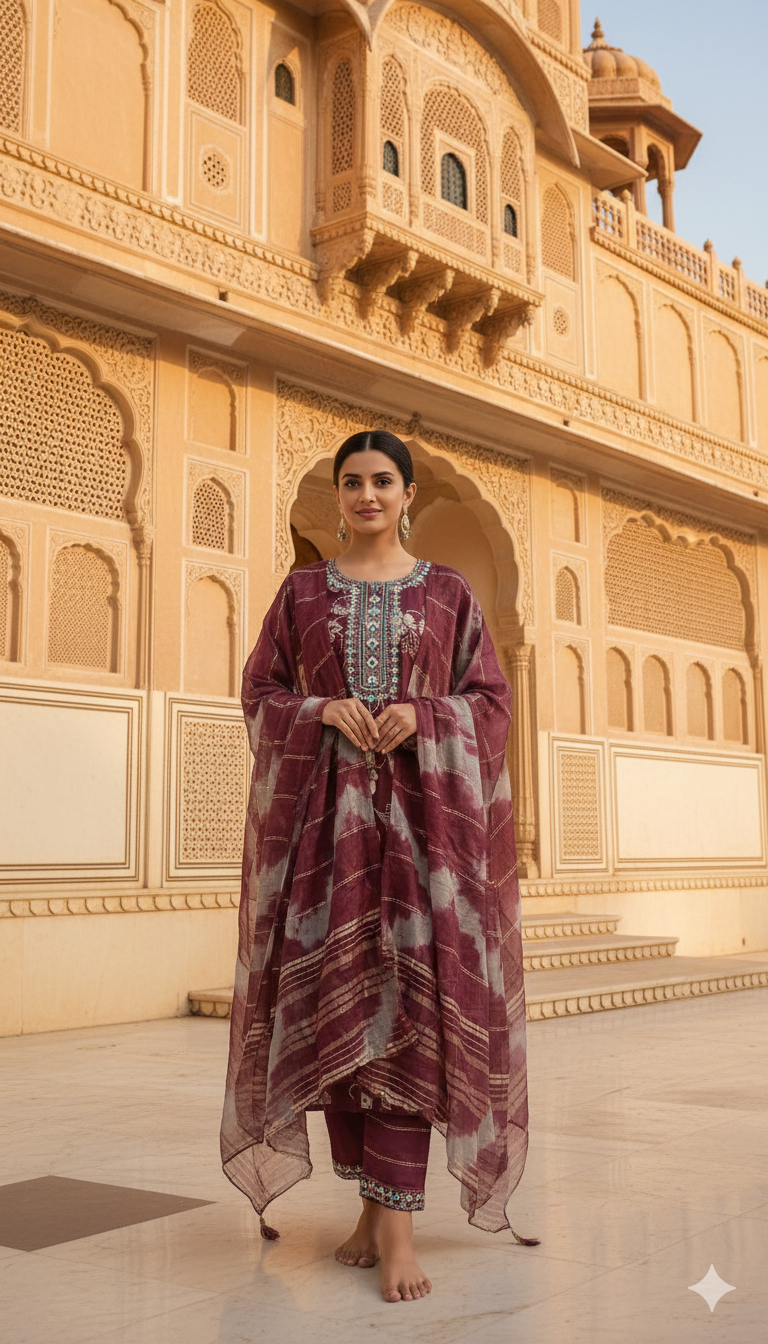 A masterpiece of traditional craftsmanship, this deep maroon ensemble is designed for the grandest occasions. The kurti is elevated by a stunning geometric yoke featuring turquoise and silver embroidery with mirror-work highlights. Paired with a unique tie-dye inspired textured dupatta and straight-fit trousers with embroidered hemlines, this look offers a sophisticated and commanding presence.